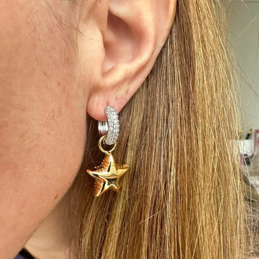 Combine seu brinco de argola com um look casual para o dia a dia. O brilho dos pingentes de estrela e coração adiciona um elemento mágico ao visual descontraído. A escolha perfeita para adicionar um toque celestial ao seu estilo.