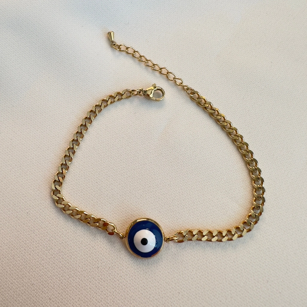 A pulseira é composta por olhos gregos esmaltados em rosa e azul. O olho grego é um amuleto utilizado desde a antiguidade para afastar o mau-olhado e trazer boa sorte, sendo também um símbolo de proteção e sabedoria.